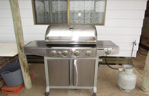 small deck at rear, large undercover area with outdoor table and chairs, hooded bbq, large fully fenced yard