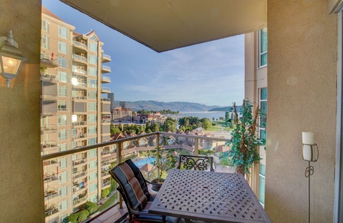 Enjoy everything Kelowna has to offer from this centrally located 10th floor apartment on Sunset Drive. Located within Sunset Waterfront Resort, this large 1 bedroom apartment offers space for 4 with a king sized bed in the bedroom and 2 twin wall beds in the den of the apartment.
