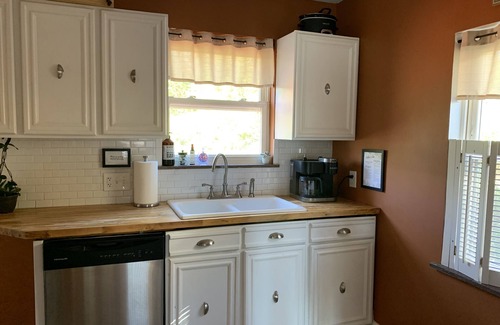 the kitchen is fully equipped with all your basic cooking needs Stainless steel appliances, dishwasher, butcher block countertops, 12-pot Coffee/Keurig, toaster, dishware for 8, knife block, dish towels and full set of pots and pans. You will find all the cleaning products you possibly need underneath the sink including pet and wine stain remover. We provide one jumbo roll of paper towels, several dish pods, trash bags, dish soap, plastic wrap, tin foil, S/P, oil, ground coffee and creamer.