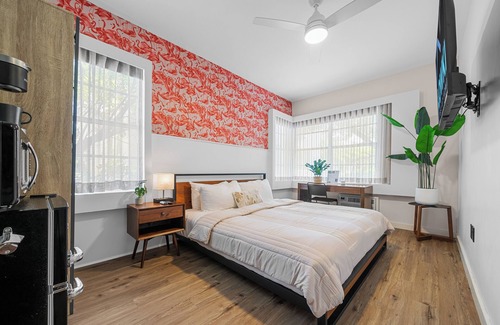 Located in the vibrant heart of South Beach, our Superior King w/ Kitchenette room offers the perfect blend of comfort and convenience, making it ideal for solo travelers, couples, or business guests looking to immerse themselves in the best of Miami Beach. The Superior King w/ Kitchenette at Greenview by Lowkl is positioned between the lively streets of Collins Avenue and Ocean Drive, just steps from pristine sandy beaches, world-class shopping at Lincoln Road Mall, and the renowned nightlife South Beach is famous for. With the Miami Beach Convention Center nearby, guests also have easy access to major events and conferences. The room features a plush king-sized bed, ensuring a restful night’s sleep with its soft, high-quality bedding. Modern amenities include high-speed Wi-Fi, a large flat-screen TV for entertainment, and a mini-fridge to keep your beverages and snacks cool. A dedicated workspace with ample lighting and a comfortable chair is provided for those who need to catch up on work. The room’s spacious layout includes a relaxing seating area perfect for unwinding or enjoying a good book. The ensuite bathroom stands out with its contemporary fixtures and sleek design. It includes a spacious walk-in shower, a large vanity with ample room for personal items, and complimentary toiletries to enhance your stay. Guests benefit from several complimentary perks, including free parking available between 10:00 AM and 6:00 PM, two free beach chair rentals for relaxing by the ocean, and room service every three days to maintain a fresh and clean environment. Additionally, luggage storage and towel exchange services are available to further enhance your comfort. From the doorstep of your room, you can dive into the vibrant life of South Beach, whether you're here to sunbathe, savor gourmet dining, or explore the iconic art deco architecture. The Superior King w/ Kitchenette Room provides a luxurious yet comfortable base to experience everything Miami Beach has to offer. Ready for an unforgettable stay in Miami Beach? Book your stay in our Superior King w/ Kitchenette Room and discover why Greenview by Lowkl is the preferred choice for travelers seeking comfort, location, and value in South Beach..