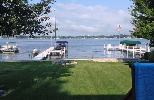 Our water front unique cottage is located on the East side of Lake Syracuse. Steps away from the water, you will enjoy amazing sunsets over the lake and the on shore breeze keeps things cooler. We have a sandy bottom great for swimming! Sleeps up to 12 5 bedrooms, 1.5 baths, full kitchen, large front deck, private pier, washer, dryer, outside fire pit, and endless entertainment watching all the lake activity.