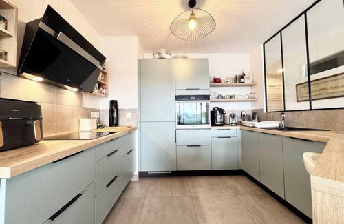 - open-plan fully-equipped kitchen with oven, airfryer, fridge, dishwasher, cooker, toaster, nespresso coffee machine and sideboard