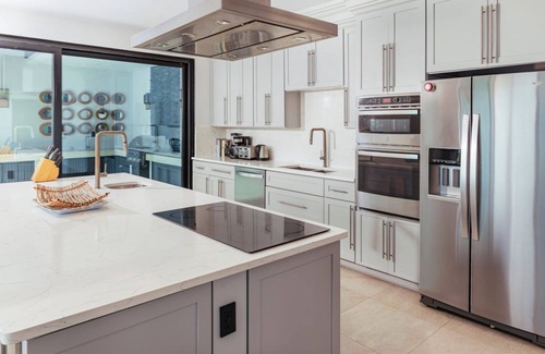 Nestled on a lush green headland on Antigua’s sparkling southwest coast, Ocean 5 is a stunning four-bedroom villa with a private pool and panoramic views of the Caribbean Sea. Part of the Tamarind Hills boutique collection of oceanfront villas and suites, Ocean 5 is designed with laidback Caribbean living in mind. With sun-soaked outdoor spaces and dreamlike vistas, you will be ready to return to this enchanting island paradise time and time again!The large wraparound terrace provides guests with a fantastic outdoor living space, complete with an infinity-edged swimming pool and a secluded sunbathing area. You will be drawn out to the terrace every morning by the radiant blue skies overhead and the sound of the gently lapping waves below. After a refreshing dip in the pool, guests have a covered outdoor lounge area where they can relax with a good book for the rest of the afternoon. The terrace also features a casual outdoor dining area and a fully equipped kitchen with a barbecue grill, the perfect place to prepare memorable meals with a cocktail in hand.Inside, the villa continues to exude effortless charm with relaxed, contemporary design touches, echoing the natural colours and textures of the surrounding island. Wide patio doors lead from the terrace into a stylish lounge area, where there is a sumptuous corner sofa and a large flatscreen TV, making this the ideal spot for everyone to unwind after a day spent exploring Antigua’s beaches. The open-plan lounge flows harmoniously into a spacious dining area with more beautiful views. Adjacent to the dining area, the villa’s well-appointed kitchen features a large island and modern appliances, including a coffee machine for your morning coffee on the terrace. A charming double bedroom is also located on the ground floor, complete with an en-suite bathroom featuring a walk-in rain shower.Three more fabulous double bedrooms with king-size beds and smart TVs are available on the first floor of Ocean 5. The master suite features a spacious oceanfront balcony with spectacular views, where guests can enjoy a leisurely breakfast or take in a romantic sunset. This suite features an en-suite bathroom with a rain shower and a luxurious bathtub, while every other bedroom includes an en-suite bathroom with a walk-in shower. Air-conditioning is featured throughout the villa, with ceiling fans fitted in each of the bedrooms as well as the main living space. This island oasis is ideally situated between two of Antigua’s dazzling beaches: Darkwood Beach and Ffryes Beach. On Ffryes Beach, the resort’s private sun loungers are laid out on the sand. Guests have exclusive access to Tamarind Hills Beach Club a few steps away, boasting its own bar, restaurant and salt-water swimming pool. For a choice of excellent restaurants, the marina at Jolly Harbour is only a five-minute drive away.