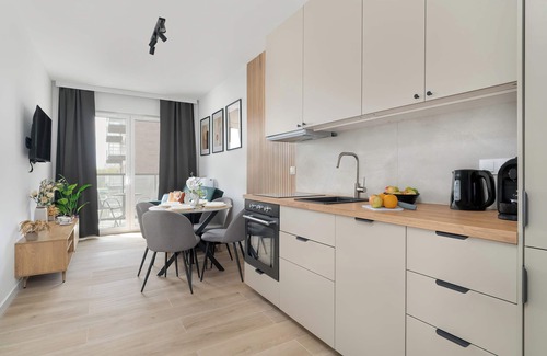 the 31 m² apartment can accommodate 4 people The interior decorated in bright colors exudes an atmosphere of freshness, lightness and elegance. The apartment consists of a living room, dominated by a sofa bed, providing comfortable rest and relaxation. Bright walls and delicate accessories give the interior lightness and coziness, creating an ideal place to spend time with family and friends. The living room also has doors to a charming balcony, where garden furniture encourages you to relax outdoors. You can also enjoy coffee, freshly brewed from a capsule coffee machine. The kitchenette, harmoniously incorporated into the living room, encourages culinary experiments. Equipped with modern appliances, including a fridge-freezer, induction hob and dishwasher, it facilitates everyday meal preparation. A cozy table with four chairs is an ideal place for eating meals and meeting for coffee. The bedroom with a comfortable double bed is an oasis of peace and relaxation, where soft lighting and bright colors encourage rest. The bathroom provides a place to relax and unwind, a shower and a washing machine facilitate daily hygiene and care activities. This apartment is an ideal choice for those who value bright, spacious interiors and comfort in everyday life.