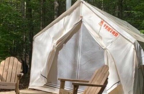 each campsite includes a 10'x12' safari-style canvas tent on a raised platform, and you'll find one queen bed or a queen-size bunk bed inside (each site is different, see photos for the exact setup) Larger groups can also use the extra 5-person pop-up dome tent that’s provided (you’re welcome to bring your own camping gear too). You'll also have a 6-ft picnic table, outdoor fire pit, 2 Tentrr Adirondack chairs, and a heating source to keep you warm and toasty at night.