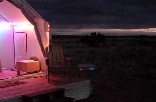 welcome to your second home Only 15 minutes from the Petrified National Forest. Enjoy the breathtaking scenery of the large open sky. Onsite you'll have an attentive camp keeper to address all of your needs. Serenity will have you wanting more and never wanting to leave. Arizona has some of the darkest skies on the planet. Bask under the dazzling star lit sky. Plan your visit around celestial events. Inside your home away from home you'll find a comfortable queen size bed. 5 gallons of fresh water with dispenser. A propane heater. Fairy lights to illuminate the indoors. And of course a convient loo.
