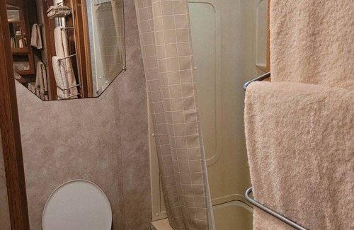 across from the 5th wheel is a large restroom with a combination washer and dryer for your use should you need to wash clothes
