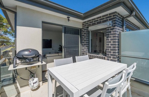 step inside to discover a sanctuary of modern design and comfort The heart of this residence is its open-plan living room upstairs, bathed in natural light from large windows and offering serene greenery views. Kick back and watch TV, with split-system heating and cooling to keep temperatures comfortable. This space seamlessly transitions to a balcony equipped with a BBQ and dining table, perfect for enjoying meals with a view. A fully-equipped kitchen makes it easy to whip up a feast, with a six-seater dining table inside.