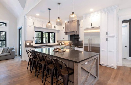 after a day of skiing, soak your sore muscles in the home's private jacuzzi, or warm up with a coffee or hot chocolate from the complimentary coffee bar! the space features a brand new kitchen and dining area, with new stainless steel appliances Enjoy your favorite shows on a wall-mounted flatscreen, Smart TV with full cable. relax in the downstairs master bedrooms, both featuring king beds and private bathrooms! hang out with friends upstairs in the home's bar and game room, featuring a shuffleboard table!