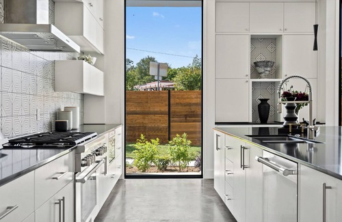 the fabulous home sits on a quarter-acre lot just minutes away from zilker park, barton springs, rainey street, moody center, austin city limits, the university of texas, q2 stadium and downtown austin Professionally designed and appointed with beautiful furnishings, this magnificent space offers four bedrooms -- three bedrooms in the main house plus a one bedroom/one bath attached casita. The home is perfect for multiple family use and sleeps 8 people.