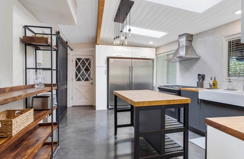 this remodeled ranch is filled with soft, natural light and is perfectly scaled Sitting on an acre, this home offers an open living area with a gas fireplace that anchors the home, freshly painted, contains new concrete overlay floors throughout & a dual level floor plan with in-room suite on the lower level. Newly renovated master bath has huge open steam shower. The modern north-facing courtyard entrance offers a large patio and seating area w/water features. Home is wonderful for entertainment or restorative introspection.