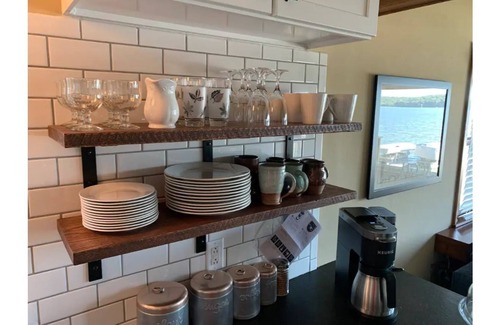 -new kitchen has open shelving, granite counter tops, stainless steel appliances and is fully equipped