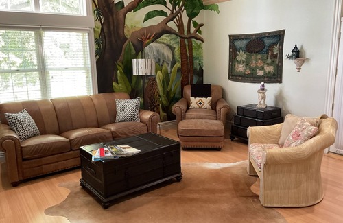 Welcome to the Bombay Getaway at Arlie’s Farm, a one of a kind experience where you are instantly captivated by the serenity and breathtaking views surrounding you. Conveniently located 6 miles from Springfield, MO, the farm is a refreshing concept of modern technology mixed with the roots of family and a team of passionate growers. Arlie’s Farm is a fully working hobby farm that boasts a beautiful greenhouse and plenty of views. The animals will entertain you as they romp in “Ellie Mae’s Barnyard” and around the pond. The Bombay Getaway will rejuvenate you as you relax in upscale country living. With hand painted murals from local artist and decor from trips overseas, the Bombay Getaway gives a unique vacation in the Ozarks.
