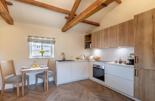 from your private parking spot, climb the steep external staircase to reach your stylish farmhouse-style home Step inside and kick off shoes in the entrance lobby, which has large storage doors for boots and bags. This leads to a smart open-plan living/kitchen/dining area. Find your spot on the plush sofa and take a moment to admire the characterful exposed beams and preserved original features. When it’s time to eat, head to the chic, country kitchen area, a lovely space to whip up dinner. After eating, unwind in the sophisticated living area while soaking up the views of the front garden. At the end of the day, retreat to the beautifully styled bedroom in the former dovecote, which offers a king-size bed and a view over the pretty orchard and ancient monument. Completing the layout is a smart bathroom overlooking the Temple Newsam Rose Garden.