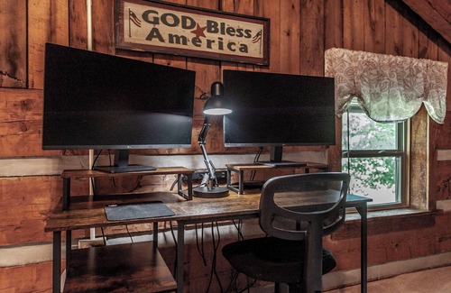 we have furnished the cabin with your comfort in mind You will find a large open living area with a stone gas fireplace for chilly cozy evenings. There is a full kitchen with everything you'll need for home-cooked meals complete with a full size refrigerator and dishwasher. The main floor master bedroom features a queen size bed and private bath with jacuzzi tub. Upstairs there is a bedroom with two twin beds plus, a loft with another twin bed, and a rollaway bed available upon request. The loft also has a desk for guest use with twin monitors and a 2nd full bath with a stand up shower. A washer & dryer are also provided for your convenience. Outside you can relax on one of two porches watching the cows graze.