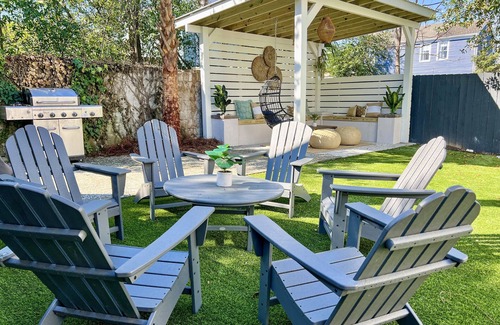 outside, the shared backyard is a tranquil oasis, perfect for relaxing and enjoying charleston's coastal climate The yard offers a large custom pergola with built-in bench seating, a swing, and poufs, as well as additional Adirondack chairs for lounging and a large JENGA set for entertainment. Fire up the grill and enjoy some outdoor cooking.
