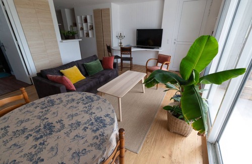 We offer you this 50 m² duplex open onto a vegetable garden. A modern and warm space, very comfortable, joined to our house of architect. Terrace facing due West, it is the ideal place to enjoy the sunset. You will live peaceful moments close to the small town and 3 minutes from the Sables d'Or beach, near the Erquy & Fréhel headlands.