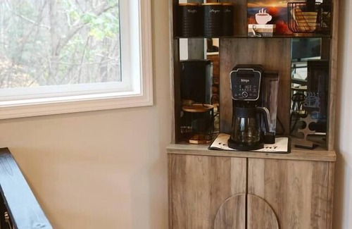 inside our charming a-frame, you’ll find a warm and inviting living space with a mix of modern comfort and rustic charm The main floor includes the master bedroom with a king-sized bed and access to the spacious back deck, where you can step outside to enjoy the crisp morning air. You will also find a bathroom with a toilet, custom tile shower, and full length mirror. The fully equipped kitchen features a full size fridge, microwave, and oven, along with all of the dishes and utensils you will need for any occasion. Wake up to our coffee bar, where you’ll find a Ninja coffee pot/Keurig pod combo. Jars of freshly ground coffee, Keurig pods, sugar, tea, and mugs that invite you to relax and enjoy your morning brew.