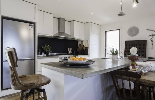 the kitchen is a chefs dream, equipped with state-of-the-art appliances and stylish concrete benchtops, all overlooking one of the many sun-soaked decks perfect for entertaining With a large wooden dining table at the centre of the living space this house will bring everyone together to connect, laugh and make memories.