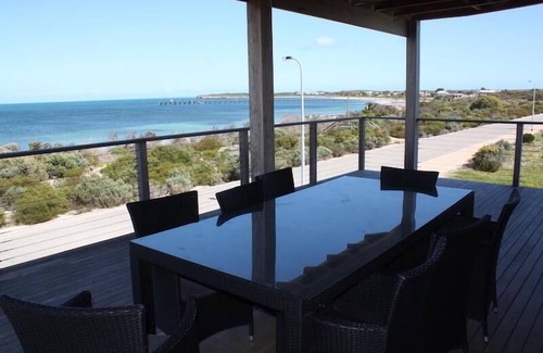 The Esplanade has to be one of the best holiday home rentals in Marion Bay. Come and enjoy the almost 360 degree views of full ocean frontage from Hillocks Point to Kangaroo Island to the Marion Bay Jetty and Penguin Point. This two story house right on the beach front with its huge 2nd story balcony through to a gorgeous large bright lounge, dinning and kitchen area. This House has everything you can ask for from absolute beach frontage ,Spectacular sunrises, just meters from the beach .It has 2 entertaining areas one upstairs and one downstairs, three bathrooms and four bedrooms,double shed parking. Perfect for two families or even couples seeking absolute privacy and indulgence..