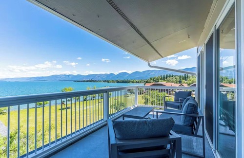 Experience spectacular mountain and Flathead Lake views from the comfort of home! Nestled near the shore, this top-floor condo boasts a spacious balcony that overlooks the water and surrounding scenery. Fire up the gas grill for an afternoon cookout and dine alfresco at the picnic table, or sip cocktails while you take in the beautiful backdrop and refreshing breeze. More outdoor fun awaits below the building, where a shared fitness center, onsite beach, and dock are available for guest use.