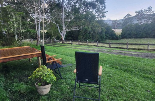 escape to the fog getaway 1 by tiny away, a tiny house nsw retreat boasting mountain views, lush greenery, and a tranquil pond with ducks Where you can enjoy farm life with sheep, cows, and free-roaming chickens, close to cafes, restaurants, and an IGA store. With beaches and Tea Gardens' exquisite riverfront dining options for you to explore.