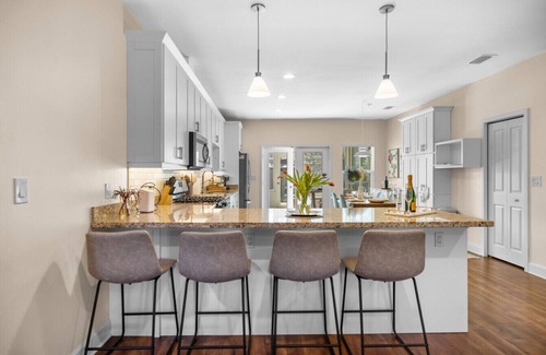 The Grove Street Gator Getaway, close to shops and university, boasts 4 bedrooms, 2 baths, an open living area with 70" flatscreen TV, a fully equipped kitchen, a sunroom, a backyard with a fire pit, a king-sized master with ensuite bath, 3 guest rooms with ample storage, and a game room in the converted garage. this lodging is perfect for those who want to be central to everything while also being able to enjoy some seclusion from the hustle!