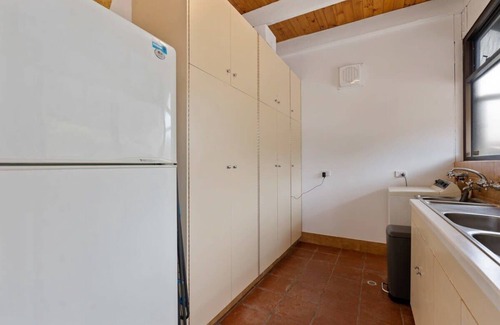 the laundry off the kitchen has the fridge, washing machine and cupboards