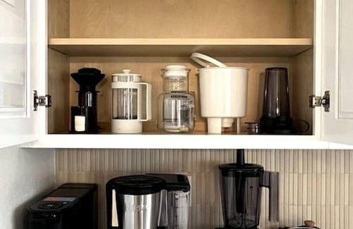 the kitchen is also equipped with a fully-stocked coffee station, offering options for keurig, french press, pour-over, and more A formal dining table seats 6, while a smaller breakfast table seats 4—perfect for quick meals or morning coffee.