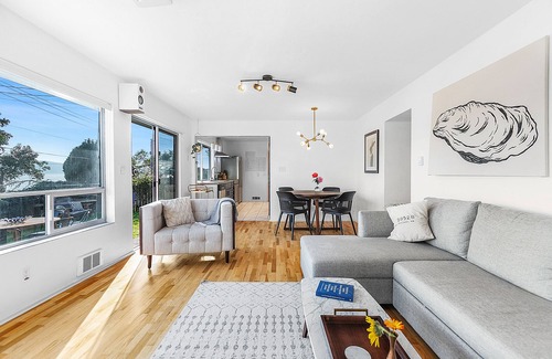 this hood canal beach house features two king bedrooms with luxury linens, plus a queen sleeper sofa Expansive windows showcase panoramic water views and fill the home with natural light.