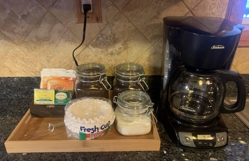 the kitchen is fully stocked with all the pots, pans, and utensils one might need to make just about any meal Additionally, the kitchen comes stocked with coffee, decaf, tea, hot chocolate, and apple cider.