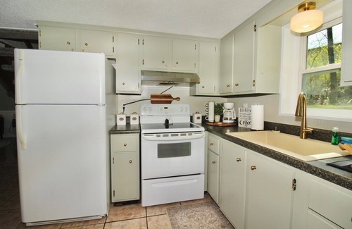 welcome to your serene getaway, where comfort meets charm in this delightful two-story, a-frame retreat As you step inside, you're greeted by a warm and inviting atmosphere, accentuated by an open-concept layout that seamlessly blends the living area with a fully equipped kitchen. Prepare your favorite meals with ease and enjoy them at a cozy dining table for four. Unwind in the seating area, the living room is complete with a TV with DISNEY + & HULU, Wi-Fi, and a selection of games for endless entertainment.