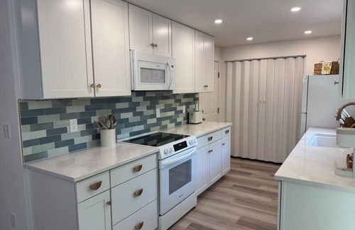 prepare snacks or meals in the fully-stocked kitchen that opens to the dining area; enjoy the company of your guests in this open-concept space The kitchen features quartz counters and beautiful gold hardware. A Keurig coffee maker and pods are provided, as well as tea and basic seasonings and baking ingredients. enjoy the filtered ro system water for drinking as well!