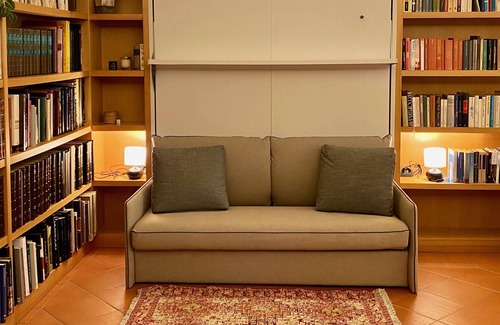 Sleep among books and frescoed ceilings. The library, originally a private library, becomes a charming open space, in the heart of upper Bergamo. Furnished with care, respecting the original environment, it offers a comfortable double sofa bed, a comfortable desk, a modern induction kitchenette, a completely renovated bathroom and a large walk-in closet. On the ground floor, easily reachable, two minutes from Piazza Vecchia, the heart of the upper town with its clubs, shops and restaurants.