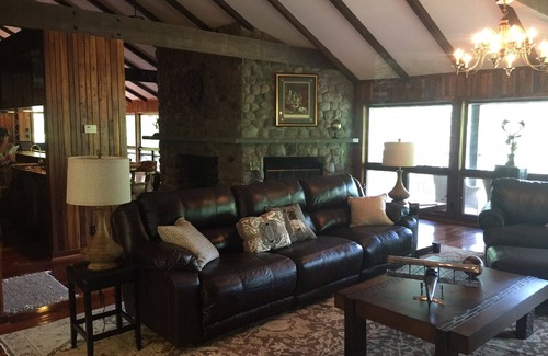 residence offers cherry flooring on the main level with mahogany interior siding, large eat in kitchen, large formal dining area, large bar, pool table, two stone fireplaces and exercise room all on the main level The terrace level offers 4 bedrooms (2 King Master Suites - w/TV and private baths including deep soaking tubs, 1 Queen w/TV , 2 Queens) 1 bath, laundry room and family room with stone fireplace, perfect for a nice private spot to read or enjoy intimate conversation.