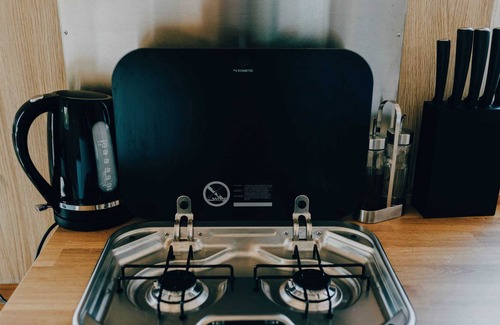 a comfortable 155-square-foot tiny home with easy access to water, split air conditioning, a kitchenette, cooking equipment, and excellent bathroom facilities with a flush toilet (connected to septic tank), basin, and (gas-heated water) shower for your use