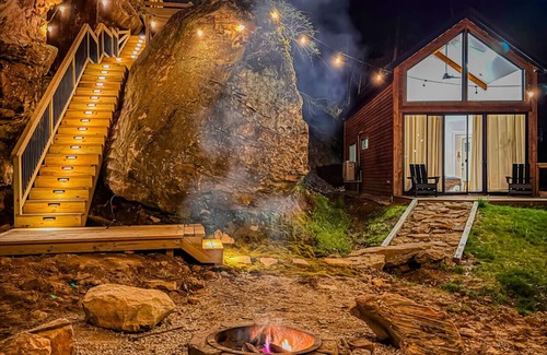 ☀ cliff-top hot-tub cabin on a giant boulder with stargazing platform built into the cliff