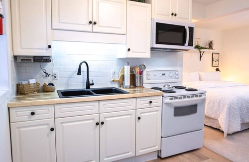 welcome to your stay at the top floor suite with mountain view, a bright and airy condo across from harrison lake Perfect for couples, solo travelers, or small families, this suite offers stunning lake and mountain views, a spacious king bed, and a fully equipped kitchen.