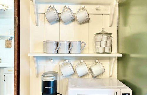inside, the farmhouse retains its historic character with three original gas fireplaces and refinished clawfoot tubs equipped with modern shower kits A bar cart complete with bourbon cocktail books sets the stage for a perfect evening, while the fully equipped kitchen, including spices and essential utensils, ensures you have everything you need for home-cooked meals.
