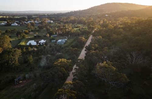 the orchard block is located at the base of mtTarrengower, near the town of Maldon, where you can rest and enjoy comfortable accommodation with easy access to water, split air conditioning, a kitchenette, cooking equipment, and excellent bathroom facilities.