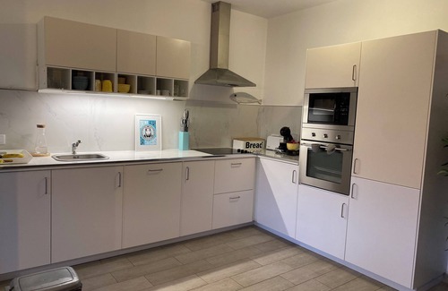 a modern open kitchen with an ample dining area with access to the garden and swimming pool, village and sea This leads to a living room with a comfortable sofa, fully equipped, with tv, table games and video console.