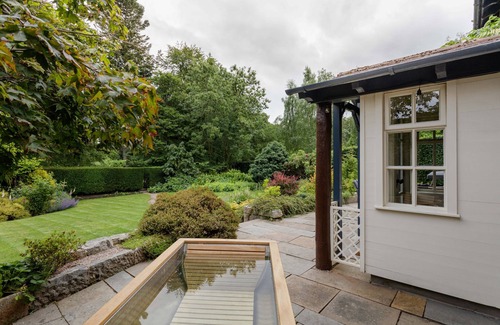 in the garden, on one side of the patio, you will find an ooni pizza oven, a top-of-the-range kamado bbq and comfortable garden furniture At the other end of the patio, you will find the woodfired hot tub, perfect for bathing children whilst also providing a relaxing soak for parents.