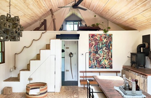 upstairs, a loft with a queen-sized bed and canvas tenting provides a cozy, semi-private sleeping space Please note the loft has limited head height, and is best suited for sleeping or lounging.