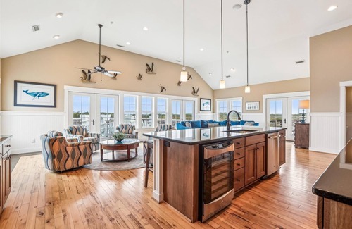 on the top floor, ocean views are generous and may be experienced from the great room, dining room, reception hall, and expansive wrap around decks All common areas are spacious, tastefully decorated to enhance a coastal ambiance, and amply capable of hosting large groups. The kitchen is thoughtfully designed and conveniently located to offer easy access to the common areas. It houses a large range, two dishwashers, bar seating, a butler's pantry, and is adjacent to a lounge with a bar, keg cooler, two under counter refrigerators and a sitting area. From this area, one may walk outdoors onto one or two very large decks, each designed to offer stunning views of the sunrise and sunset.