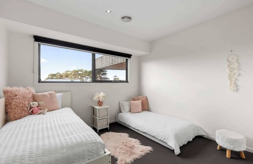 comprising four bedrooms over two levels, the home is well set up for multiple families to share the home and can be configured to sleep up to 14 guests Downstairs, you have a guest bedroom with a queen bed serviced by its own bathroom. Upstairs, there is the master bedroom with a queen bed featuring a walk-in robe and ensuite. The 3rd and 4th bedrooms have 3 x single beds each, best suited for the kids. These bedrooms are serviced by the main bathroom, which comprises a shower, bath and double vanity with a separate toilet.