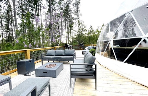 Enjoy a unique, luxury experience in nature in our private Prince Dome at Nine Pines Retreats! Step inside this fully furnished geo dome to discover a spacious retreat complete with kitchenette, heat and air, shower, toilet and the luxury heated jacuzzi tub. Lounge on the private deck complete with gas grill, blackstone griddle and pizza oven. Relax in the outdoor lounge area with firepit table, basking in the serenity of the valley of pines. Hiking trails and more available for your enjoyment.