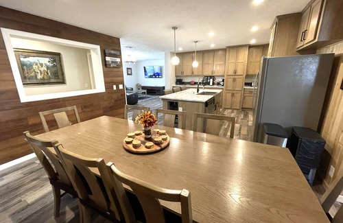The Puzzle House, named for the beautiful collection of framed puzzles found throughout the home, is your go-to spot to relax and unwind. This brand new, spacious ranch home features six large bedrooms and four full bathrooms. This roomy, open-concept home offers a master bedroom on each level along with four additional bedrooms and four full bathrooms. three large living/family rooms with 65” tvs, two full kitchens, two dining areas, a gas fireplace, game room and a separate theater room complete the amazing features of this home!