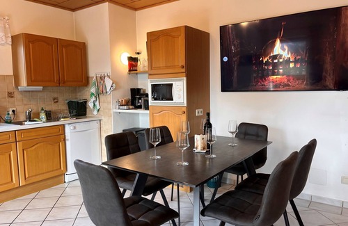 "the red apartment", 2-room apartment 70 m2, on the upper ground floor Object suitable for 3 adults + 2 children. Comfortable and modern furnishings: living/sleeping room with 1 double sofabed, Scandinavian wood stove, dining table, satellite TV and digital TV (flat screen). Exit to the terrace. 1 room with 1 sofabed and 1 double bed. Open kitchen (4 hot plates, oven, dishwasher, toaster, kettle, microwave, electric coffee machine, Capsules for coffee machine (Nespresso) free). Shower/WC. Heating, underfloor heating. Terrace 55 m2, west facing position. Terrace furniture, barbecue (portable). Beautiful panoramic view of the mountains and the countryside. Facilities: washing machine, dryer, iron, hair dryer, logs (free). Internet (WiFi). E-charging station. Please note: non-smokers only. Fire extinguisher.