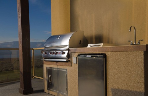 large gourmet kitchens include premium appliances, and sun tunnel skylights The outdoor kitchen includes large gas fired grill and counter with small fridge.
