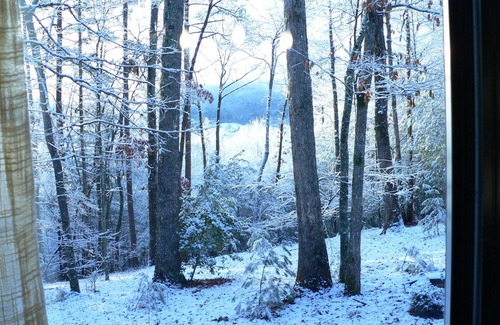 This IS the cozy little cabin that the imagination conjures whenever "cozy little cabin" is mentioned. This 2/2, 900 sqft log cabin, in the middle of 7 wooded acres, transports you to a simpler time and place to enhance your getaway. Open-raftered ceilings, wide plank flooring and hand made decor, gives the Rivercane an historic mountain feel. This cabin is located just 1.1 mile from the John C Campbell Folkschool and a mere 1/2 mile off Brasstown Rd. It's cozy dead end location is very private without being remote. Nestled into a wooded hilltop setting (just above the valley floor with an altitude of 1820ft), you'll feel hidden from the world, while being able to gaze across a slice of Brasstown Valley from the front porch as well as from the living and dining rooms. Every room has a woodland view, ever-changing as the sun makes its daily trip and the seasons serve up an ever changing palette. The back porch, screened on three sides, projects into the forest as the ground gently slopes away, giving a real "treehouse feel" as you ponder the day ahead, the one just experienced or your place in the universe. It's the perfect home base to either recharge your batteries from your work-a-day world OR regroup your thoughts after a creative day at the Folkschool.